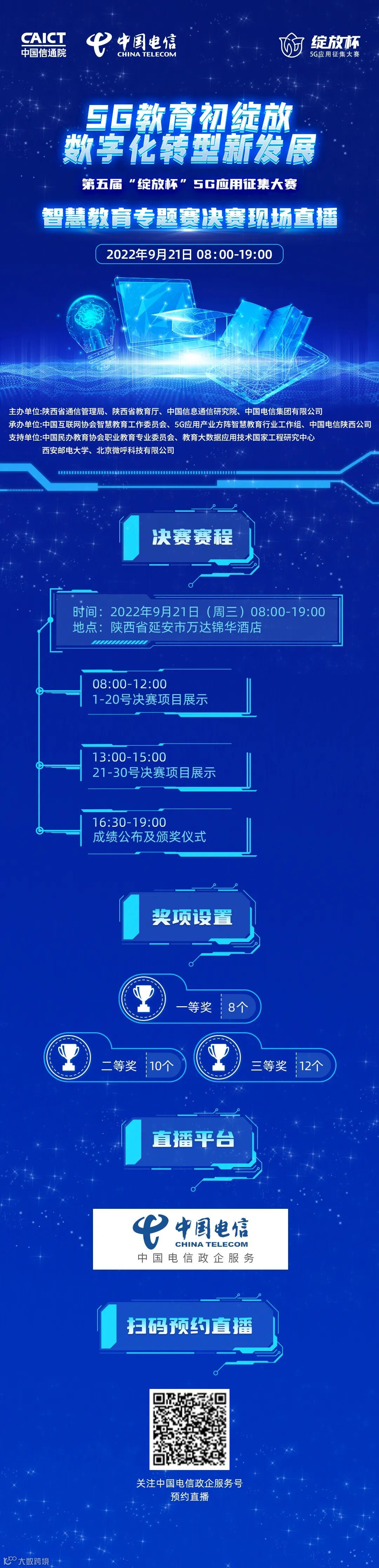 专题赛决赛与颁奖典礼将于9月21日在陕西延安举办,颁奖典礼将为一、二、三等奖颁奖。专题赛决赛与颁奖典礼将在大赛官方直播平台“中国电信政企服务”、“5G智汇堂”等媒体同步进行现场直播,敬请期待!