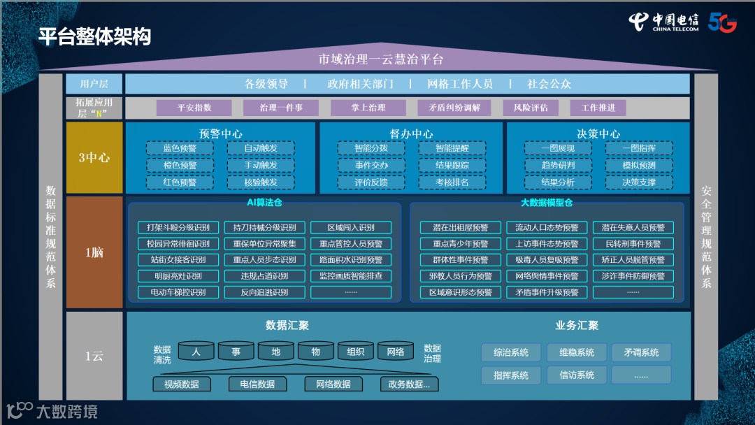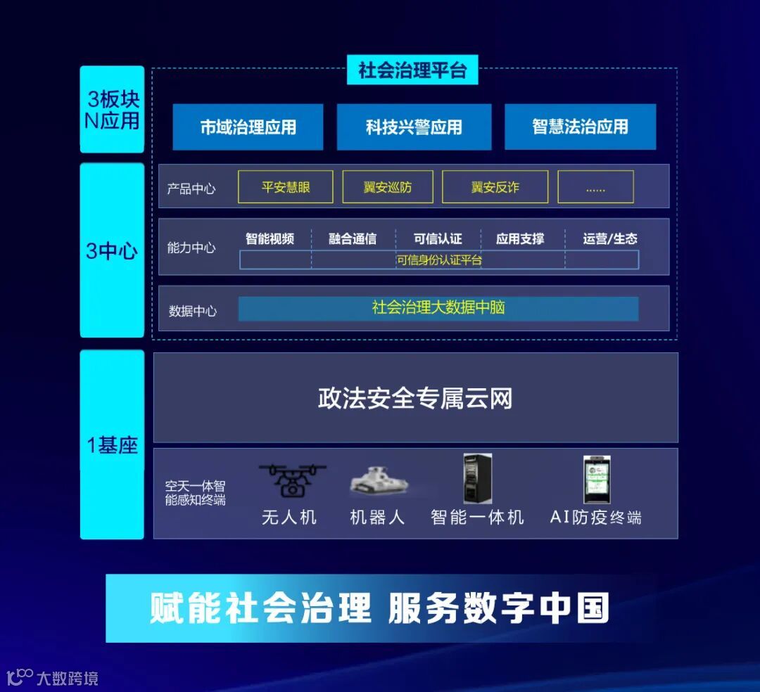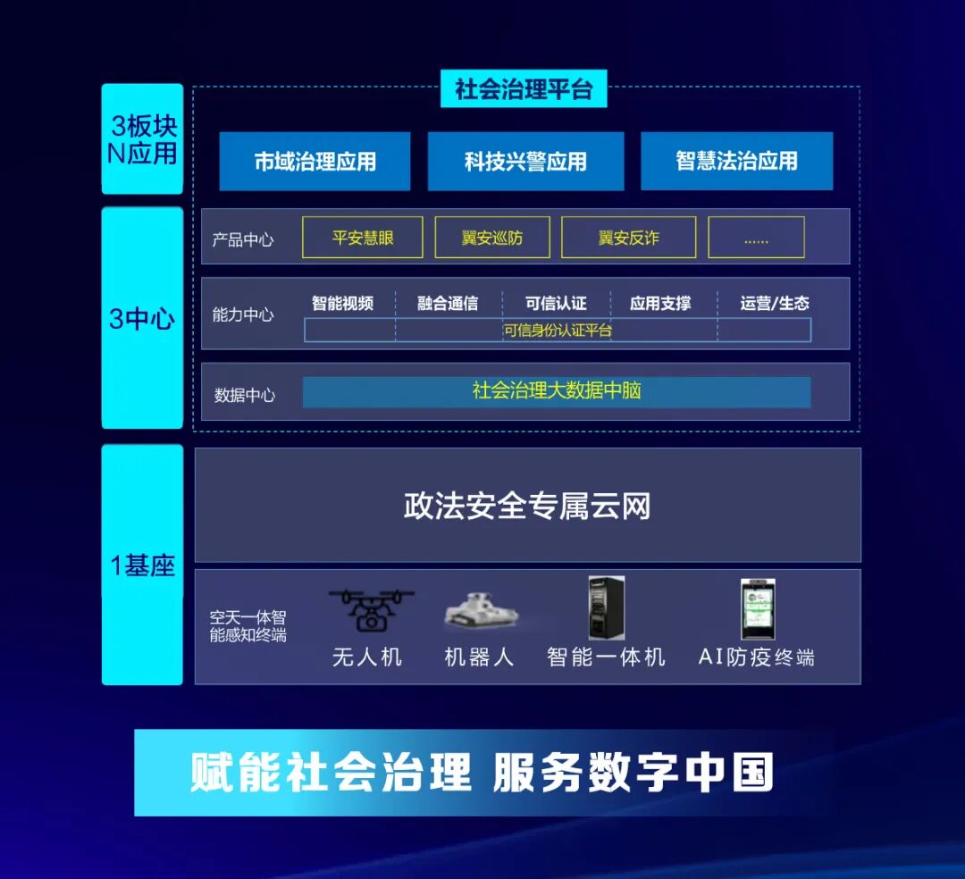 中国电信政法公安行业事业部践行党中央全面依法治国、建设平安中国的重大战略部署,助力平安中国、法治中国、社会治理现代化建设。自主研发“133N”架构的社会治理数字平台,通过1个面向政法安全专属云网信息化底座,依托数据中心、产品中心、能力中心3大中心,围绕市域治理、科技兴警和智慧法治3大业务板块,拓展N项行业智能化场景应用。以“133N”架构为基础,中国电信政法公安行业事业部研发推出社会治理大数据中脑、平安慧眼、翼安巡防、96110反诈、AI防疫一体机、可信身份认证等产品和能力平台,帮助多地政法公安行业进行数字化转型。