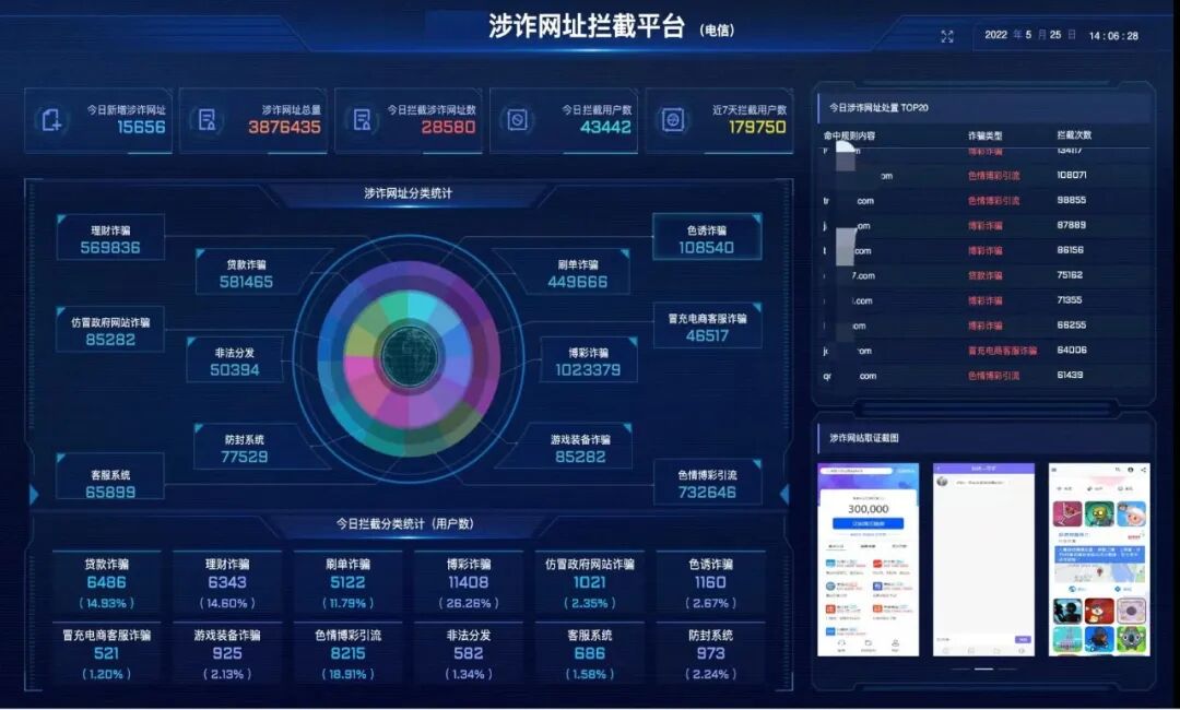 为更好的防范通讯网络诈骗,2021年江苏电信携手江苏公安,共同建设诈骗网站智能识别拦截平台,旨在打造一个事前宣传防范,事中劝阻止付,事后侦查破案的反诈体系。平台由省公安厅和省通信管理局认证网址库,在电信宽带网络和手机网络上,根据公安部门提供的涉诈案件信息构建模型,智能识别网络流量中的诈骗信息流,在用户访问诈骗网站或APP时进行有效拦截。