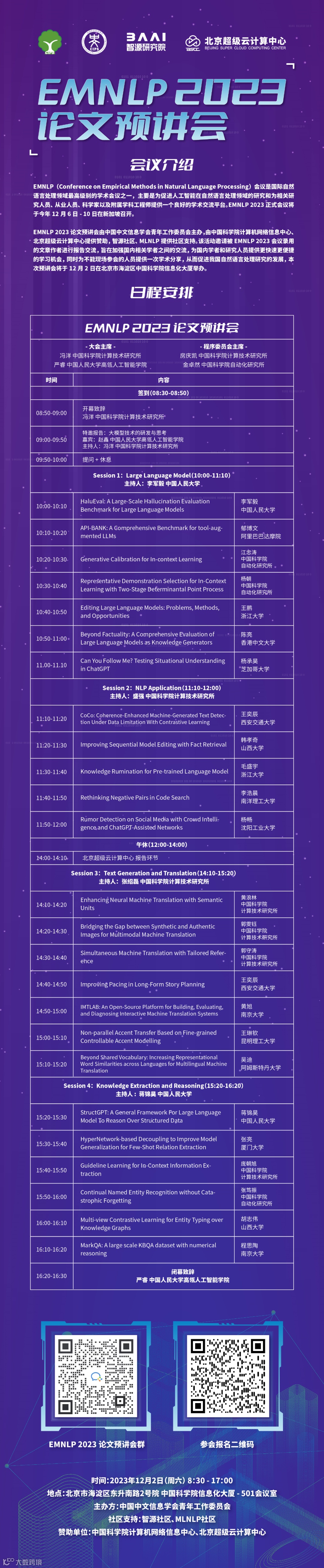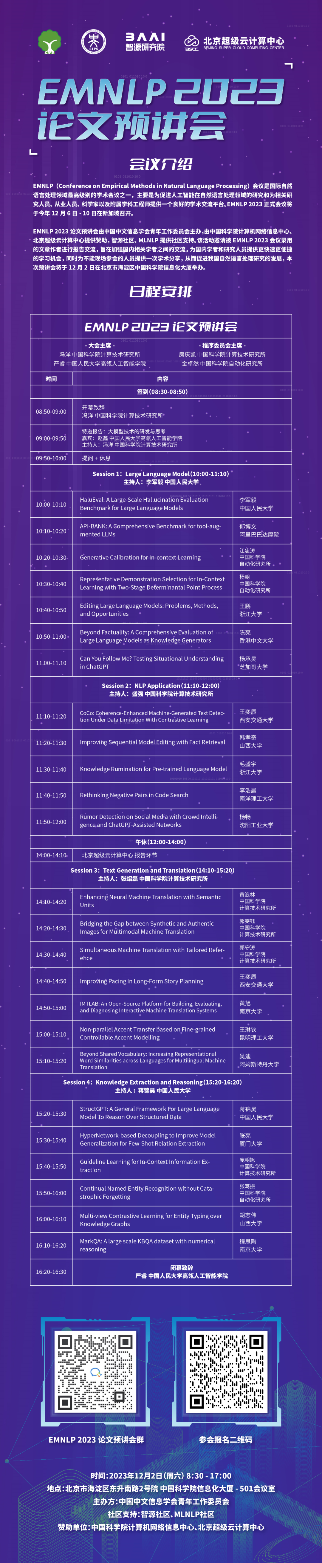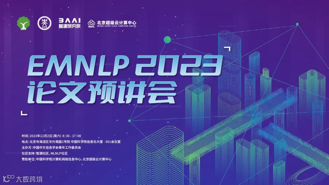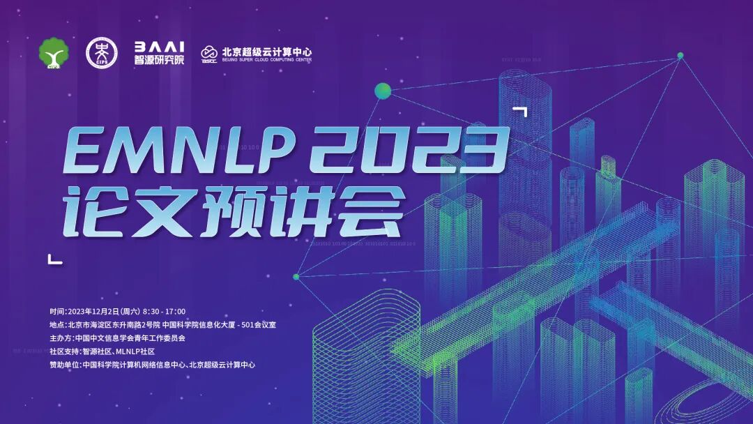 EMNLP 2023论文预讲会由中国中文信息学会青年工作委员会主办,由中国科学院计算机网络信息中心、北京超级云计算中心提供赞助,智源社区、MLNLP提供社区支持。该活动邀请被EMNLP 2023会议录用的文章作者进行报告交流,旨在加强国内相关学者之间的交流,为国内学者和研究人员提供更快速更便捷的学习机会,同时为不能现场参会的人员提供学术分享平台,从而促进我国自然语言处理研究的发展。