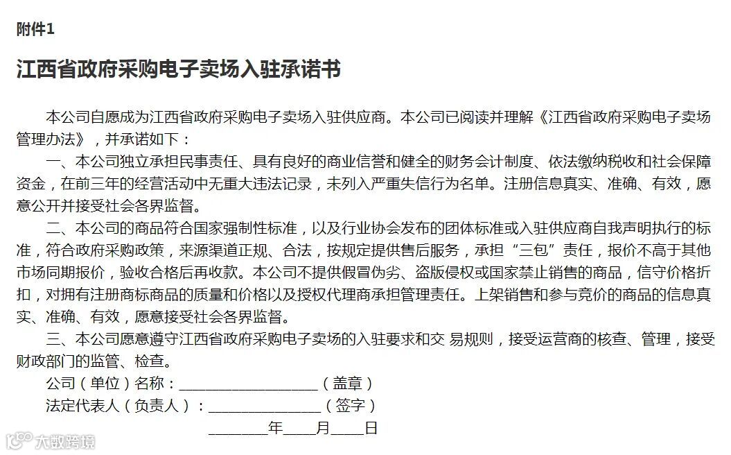 四是供应商注册成功后,上传《江西省政府采购电子卖场入驻承诺书》,盖上单位公章并由法人签字后,上传至电子卖场。入驻承诺书核验通过后,待财政部门公示、审核后供应商入驻成功。