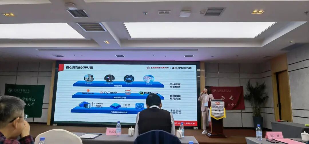 随后,北京超级云计算中心西安分中心总经理牛瑞女士以企业角度为大家介绍了北京超算AI智算云平台在赋能新药研发、材料研发、智慧金融和智慧交通方面的优势,并结合高校、科研院所、企事业单位在人工智能方面的应用场景,展示了AI智算云的强劲算力、灵活配置、开箱即用、按需使用的特点,在满足相关人工智能技术研究于训练和推理阶段对GPU算力复杂多样的需求时如何发挥作用,获得了与会嘉宾的高度认同。