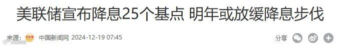 12月18日,美联储4个官员集体表示,2025年美联储降息在25个基点之内,这是一个超级鹰派的表态。