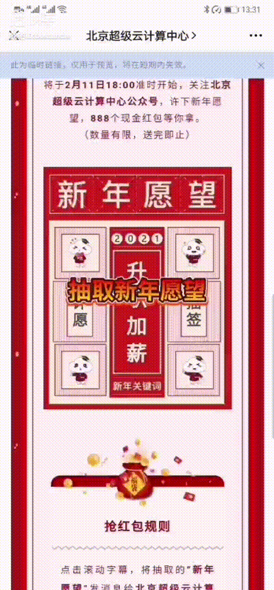 点击滚动字幕,将抽取的“新年愿望”发消息给北京超级云计算中心公众号,领取现金红包。