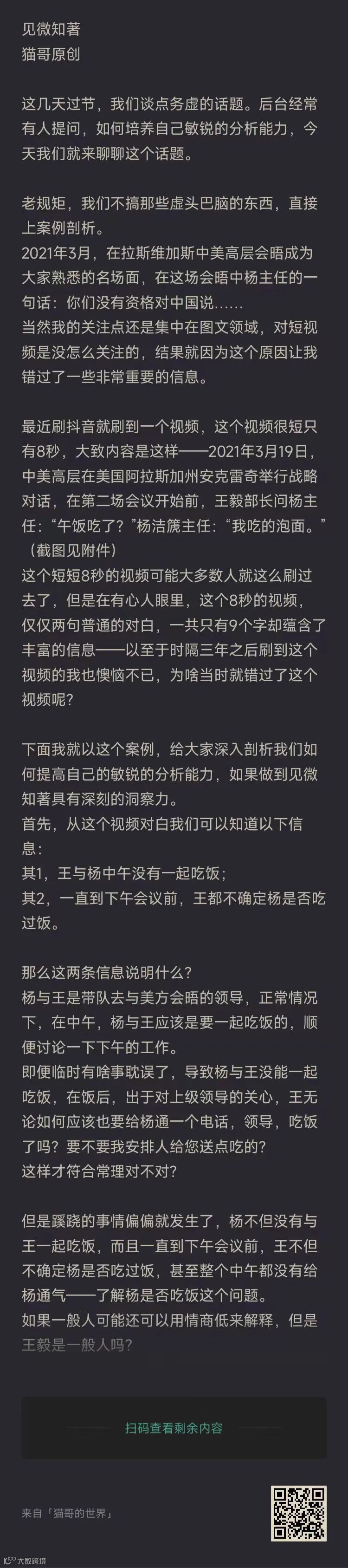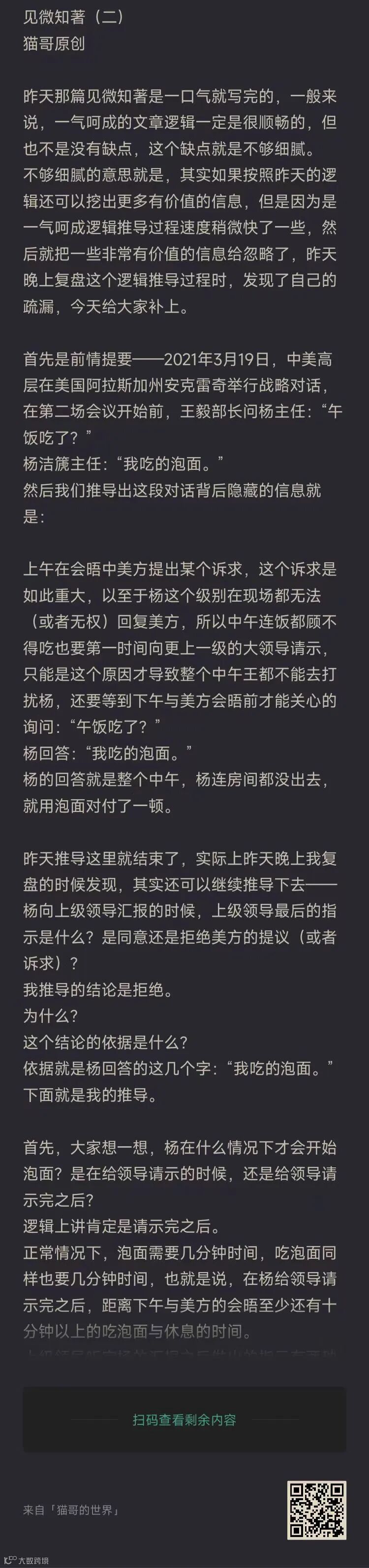 这两篇文章背景就是2021年在拉斯维加斯中美谈判的一个午后,王与杨步入谈判现场时被媒体抓拍到一句简单的对白: