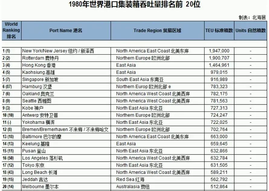 日本之后,亚洲四小龙学习日本成功经验,同样利用深水良港和路网的成本优势发展制造业,上世纪1980年代到2000年,香港港、新加坡港、釜山港、高雄港曾长期霸榜全球集装箱吞吐量前五。