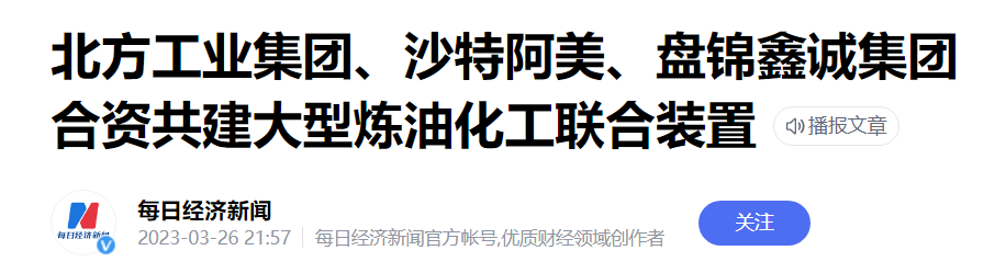 然后又与另外两家中国企业在辽宁省盘锦市设立的合资公司,将耗资122亿美元在中国东北建设日产30万桶的大型炼油化工联合装置。