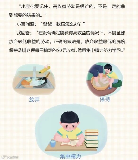 这个问题也是通过劳动实践给孩子建立一个朴素的机会成本的概念,让孩子明白,当我们选择做某项事情的同时,其实就隐含着放弃其他事物的机会成本。