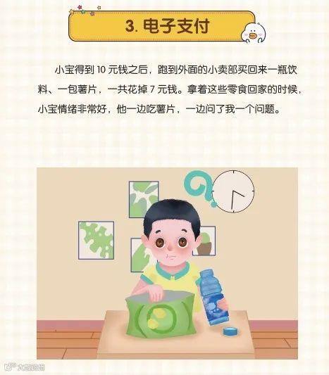 这个问题也是让孩子通过实践了解电子支付的含义,让孩子明白电子支付不是手机扫一扫这么简单,这也是要父母付出劳动成果的。