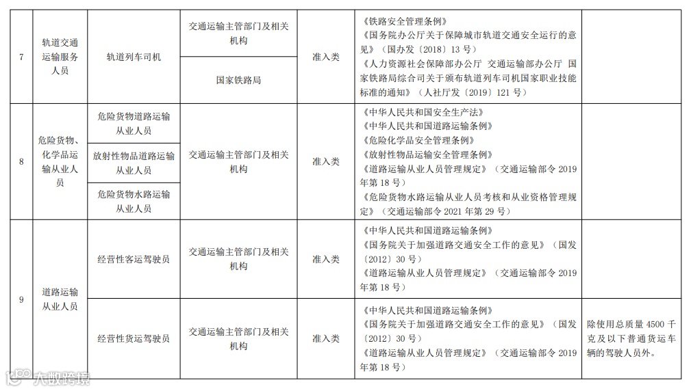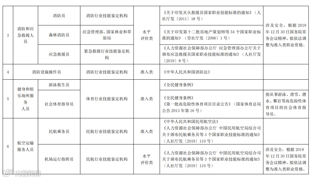 技能人员职业资格方面,水平评价类技能人员职业资格退出国家职业资格目录。国务院常务会议要求,从2020年1月起,除与公共安全、人身健康等密切相关的职业工种依法调整为准入类职业资格外,用一年时间分步有序将其他水平评价类技能人员职业资格全部退出国家职业资格目录,不再由政府或其授权的单位认定发证;推动地方人社部门职业技能鉴定中心做好职能调整,在新版国家职业资格目录中,人社部门已不再承担技能人员职业资格具体实施工作;涉及人员资格的行政许可事项作为准入类技能人员职业资格纳入目录,新增了“危险货物、化学品运输从业人员”“道路运输从业人员”“特种作业人员”“建筑施工特种作业人员”“特种设备安全管理和作业人员”等准入类职业资格。