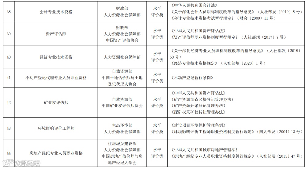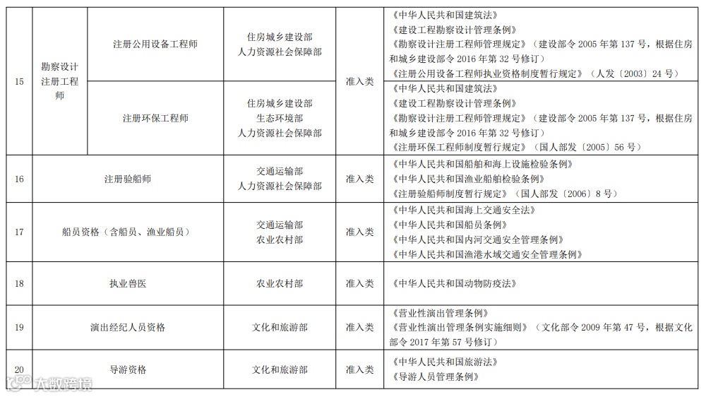 专业技术人员职业资格方面,“出入境检疫处理人员资格”“乡村兽医资格”和勘察设计注册工程师下的“注册石油天然气工程师”“注册冶金工程师”“注册采矿/矿物工程师”“注册机械工程师”退出目录,从业人员依据行业标准开展技术活动新增“精算师”“矿业权评估师”水平评价类职业资格,在医生资格下设置“职业病诊断医师”子项;新增职业资格项目均具有较强的专业性和社会通用性,技术技能要求较高;“注册设备监理师”由准入类调整为水平评价类,更名为“设备监理师”;“专利代理人”更名为“专利代理师”;“土地登记代理专业人员职业资格”更名为“不动产登记代理专业人员职业资格”;“证券期货业从业资格”更名为“证券期货基金业从业资格”等。