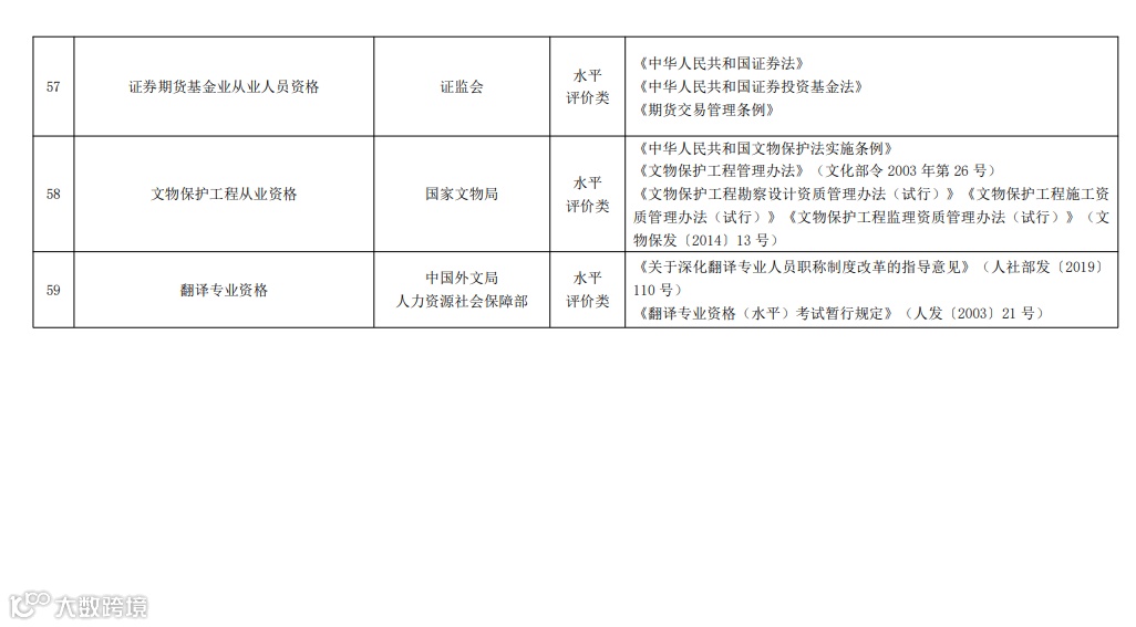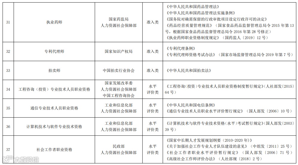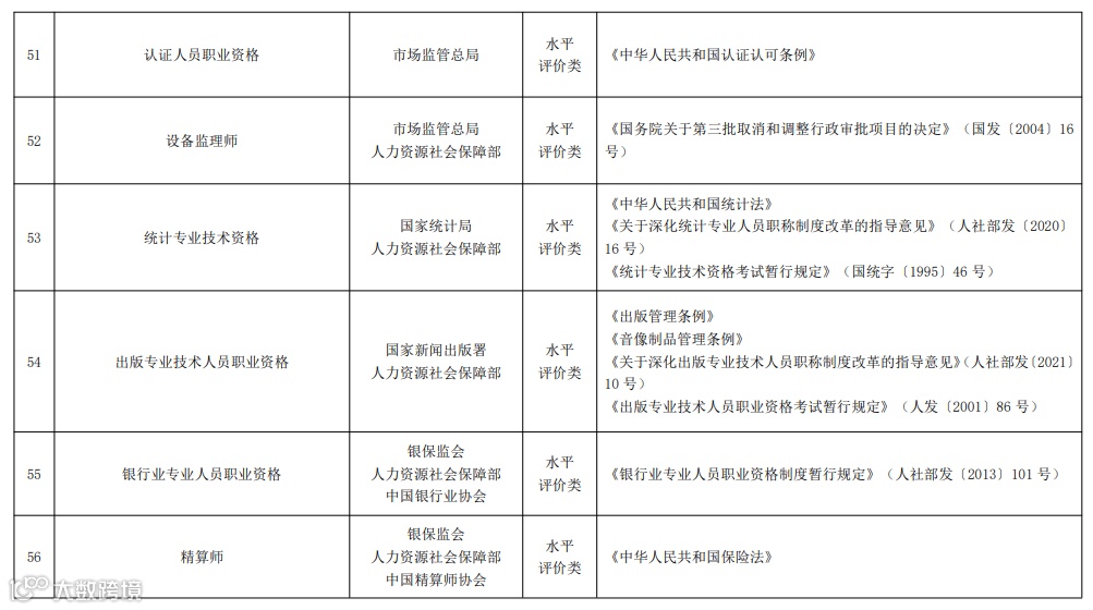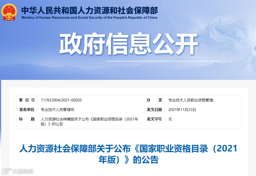 政府采购信息网(caigou2003.com)获悉,日前,经国务院同意,人力资源社会保障部近日公布了《国家职业资格目录(2021年版)》(以下简称《2021目录》)。《2021目录》共计72项职业资格。其中,专业技术人员职业资格59项,含准入类33项,水平评价类26项;技能人员职业资格13项。
