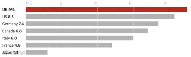 要说通胀在当今的世界也不算啥稀奇的事了,但英国的通胀显然不寻常,首先跨过了10%的大关,成为CPI涨幅达到两位数的G7国家,现在英国的通胀也是G7最高。
