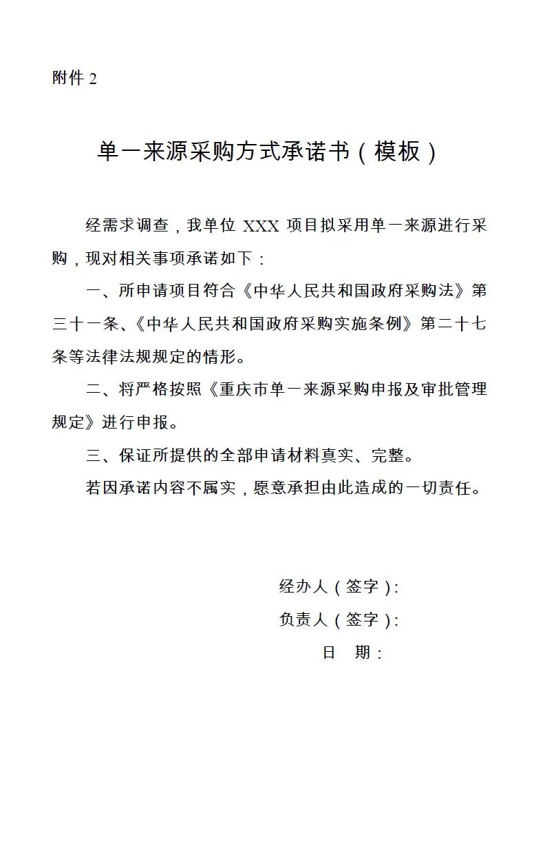 重庆市财政局日前印发了《关于启用<单一来源采购方式专家论证表>(模板)和<单一来源采购方式承诺书>(模板)的通知》(渝财采购〔2021〕10号,以下简称《通知》)。《通知》指出,为进一步规范单一来源采购方式的论证和申报,根据《政府采购法》及其实施条例和《重庆市单一来源采购申报及审批管理规定》(渝财采购〔2016〕56号)的相关规定,重庆市财政局针对专家论证和申报环节启用《单一来源采购方式专家论证表》(模板)和《单一来源采购方式承诺书》(模板)。