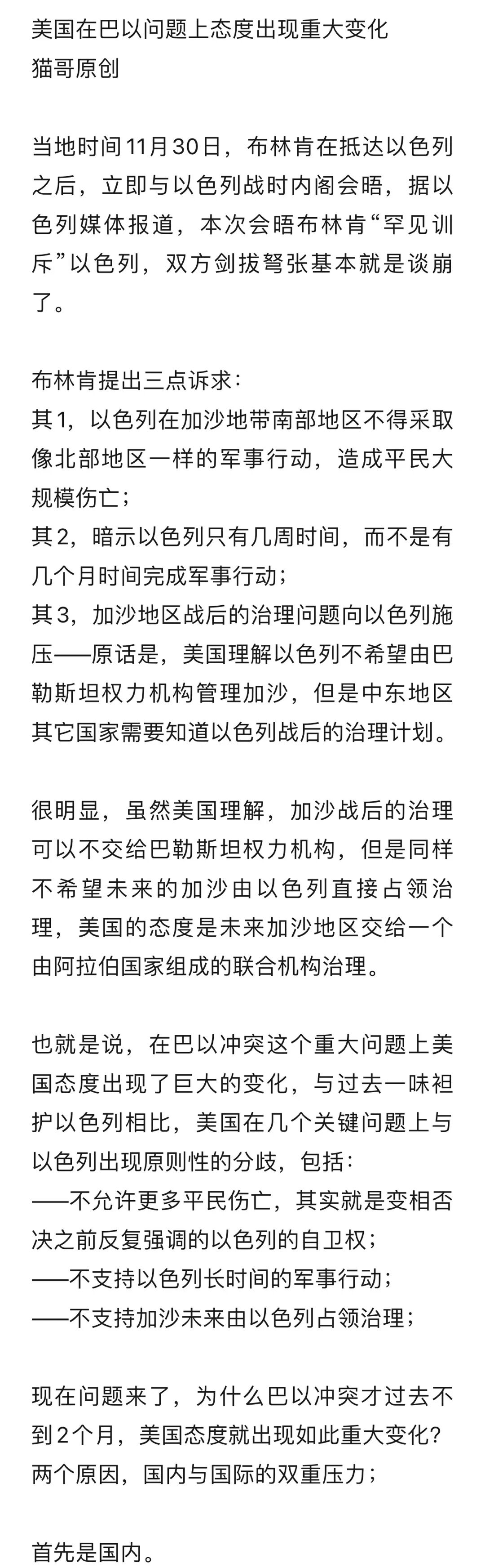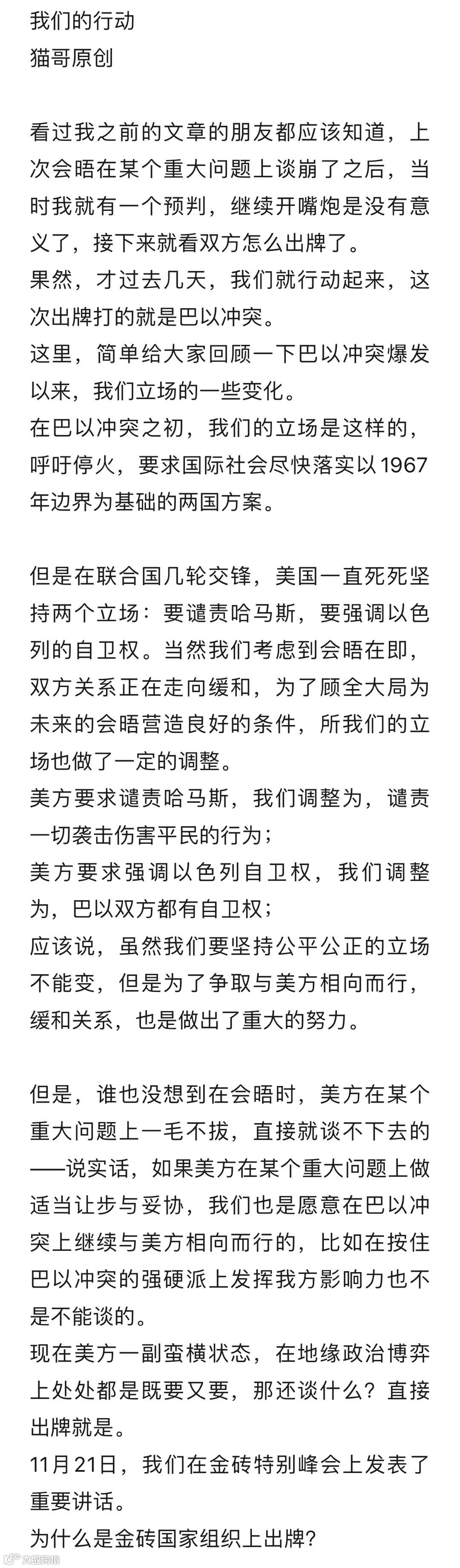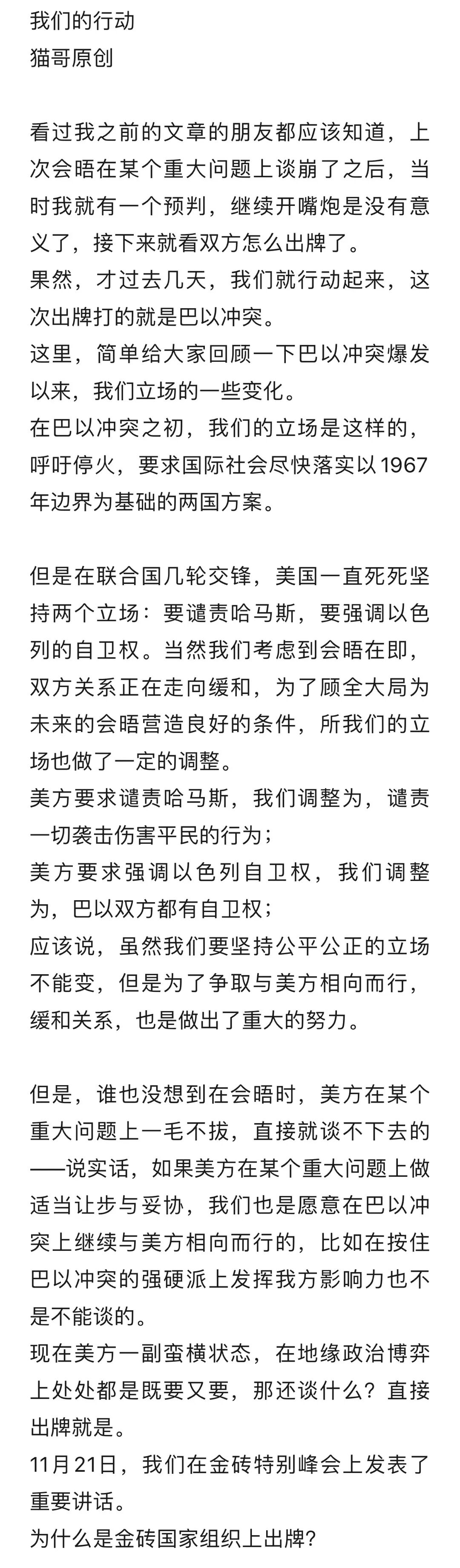 ——自从会晤谈崩了,巴以冲突中我们出牌了,某种意义上我方已经放弃了与美方相向而行的立场,选择对以色列空前强硬。