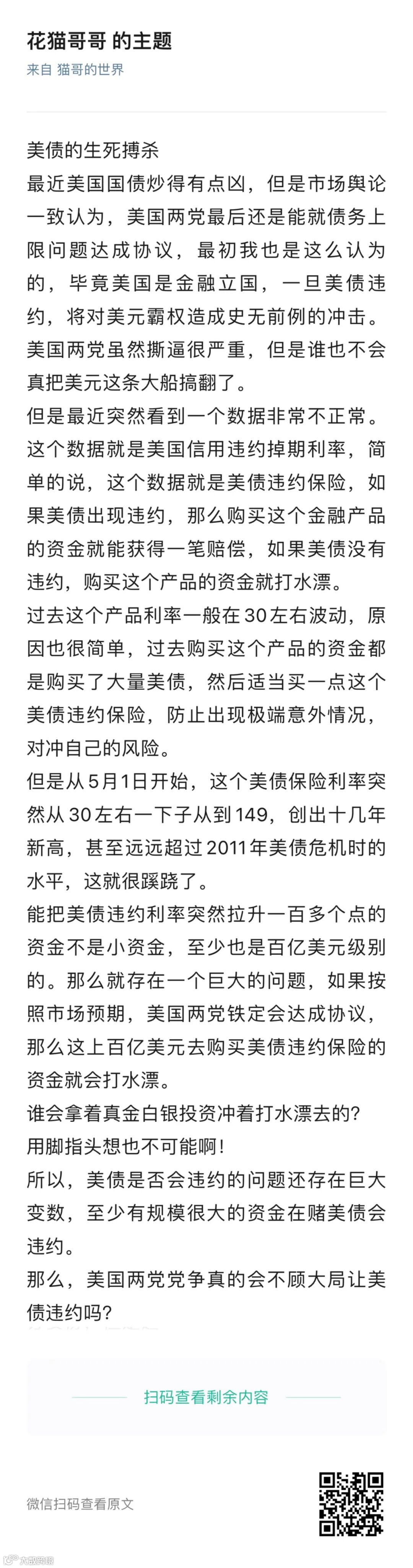 PS:最近美国两党就国债上限问题吵得很凶,过去每次两党都演戏做全套,总在最后一刻达成协议,这次我隐隐有种不一样的预感,欢迎大家来星球交流: