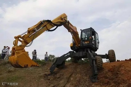 这是一种全地型多功能挖掘机和多工具、多功能平台,它有四个支脚,使挖掘机的适用性和稳定性大大提高,非常适合在凹凸不平和狭小的场地上挖掘作业。