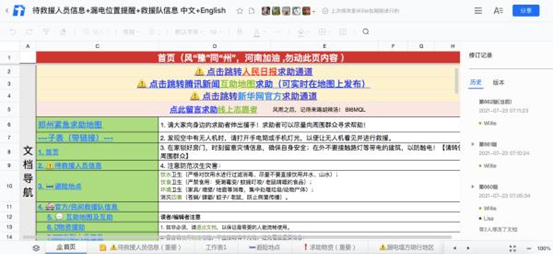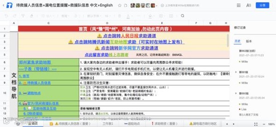 比如在2021年河南水灾中,一名大学生在腾讯云文档中创建了《待救援人员信息》共享编辑文档,搜集各种救援信息。