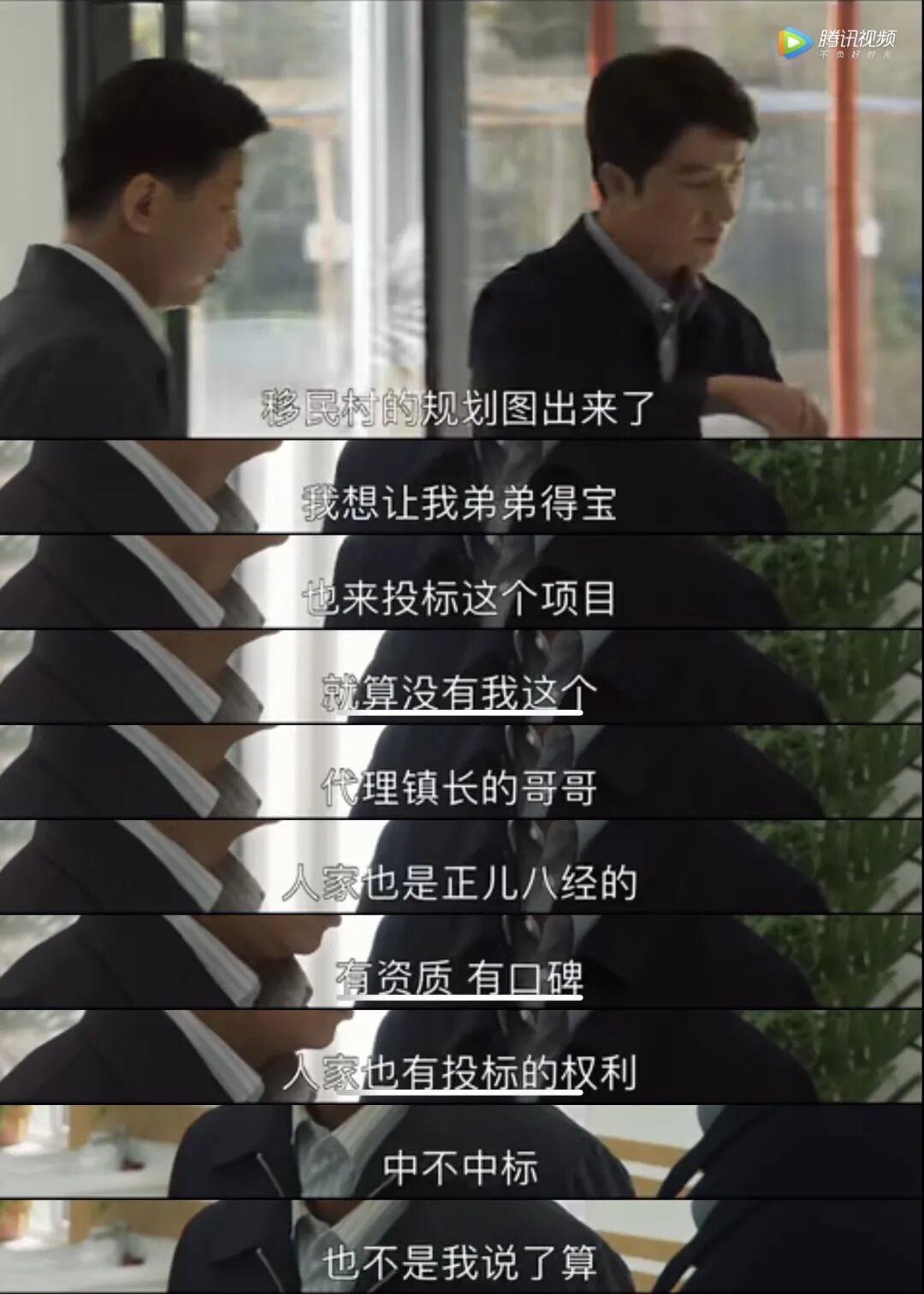 马得宝听镇上的人说哥哥被停职的事,就因为自己中标。想着哥哥当上镇长不容易,决定退出中标项目。马得福劝马得宝既然接下这件事情,就好好干,再说组织上也没有处理他,只是调查期间他是该回避。马得宝现在才知道马得福在镇上干点事有多么难,一开始还埋怨马得福不给自己行个方便,现在发现是真的不行。马得宝跟马得福保证,一定把这次的移民村项目干成标杆工程,让那些胡说八道的人永远张不开嘴。