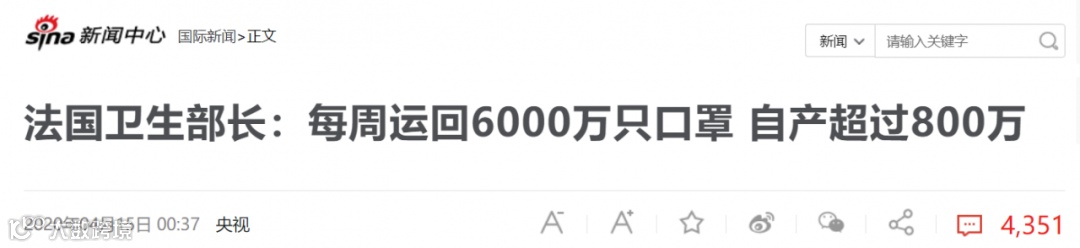 这个新闻是这样描述的,4月14日,法国卫生部长韦兰对媒体表示,从4月8日以来,法国已经接受从中国运回的6000万只口罩,接下来每周将保持进口6000万只口罩,自产800万到1000万只口罩的节奏。