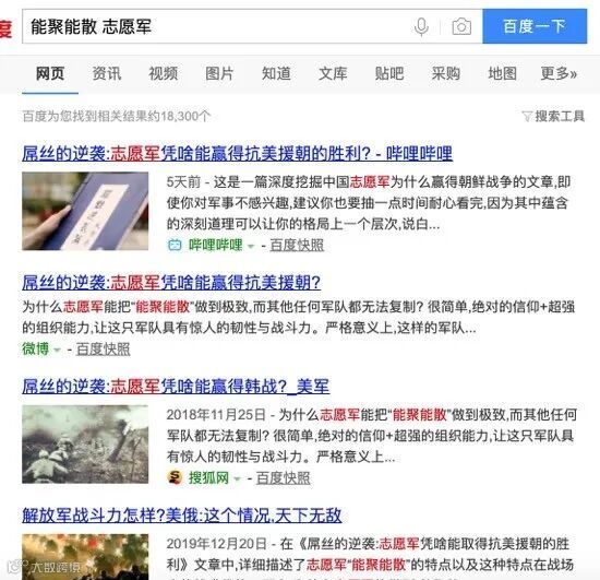我的助理出于好奇,在搜索引擎里输入“能聚能散、志愿军”,结果,不好意思,出处都是我这篇文章。