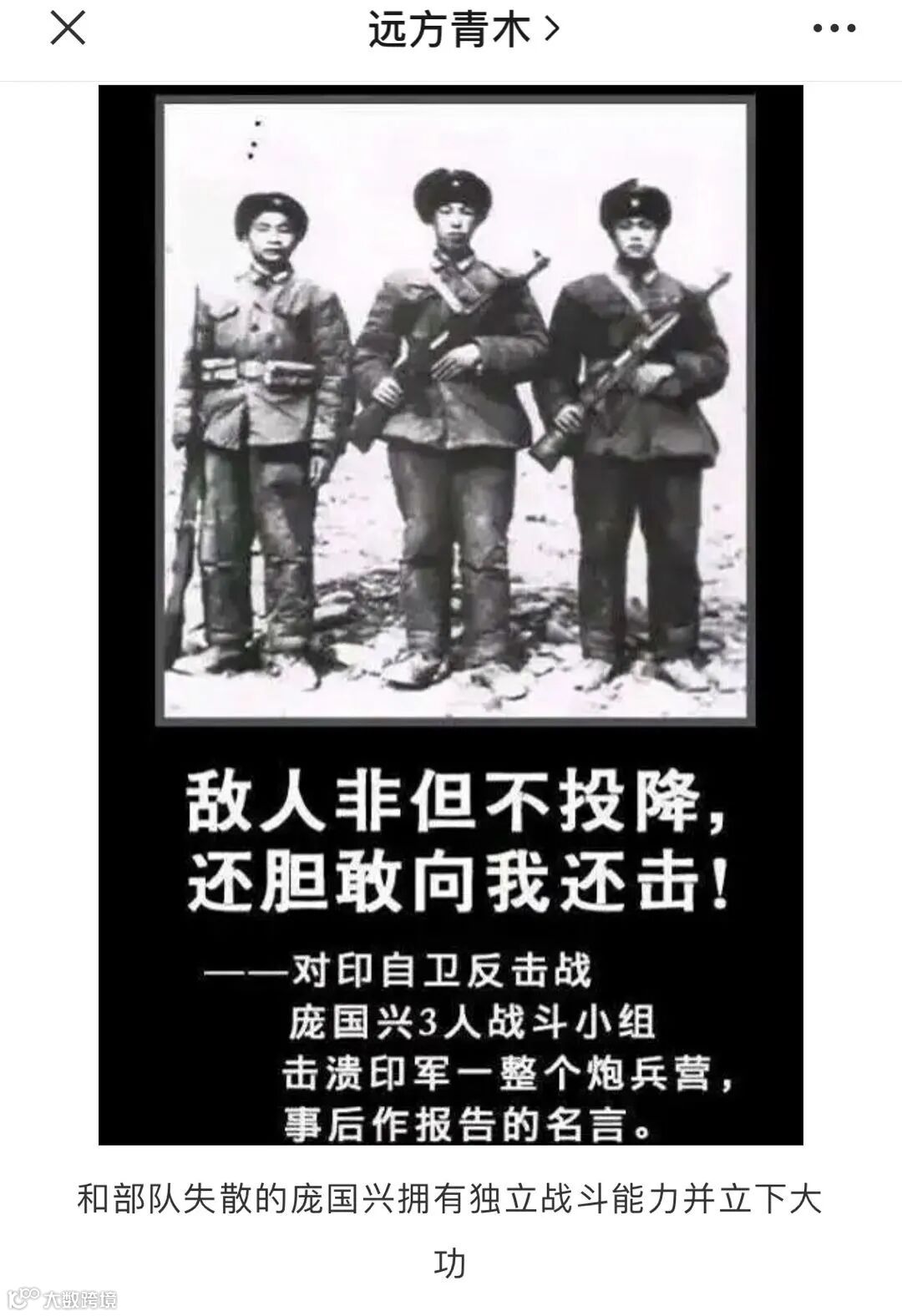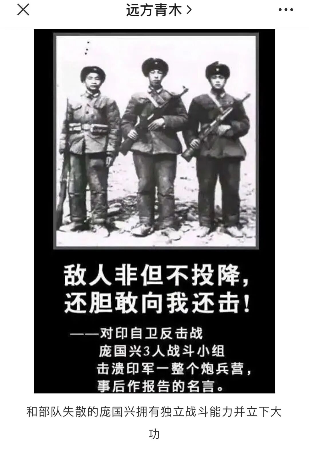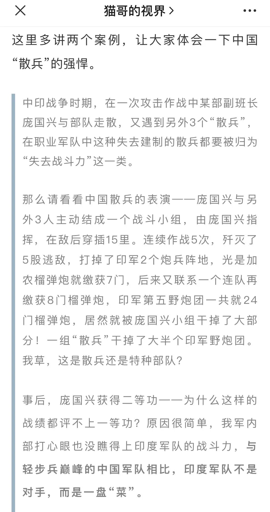 你这篇文章是蹭最近印度的热点,结果全文大部分都在写志愿军,最后总得回到印度的主题啊,所以你的文章引用了1962年庞国兴的一个战例,这是我的文章: