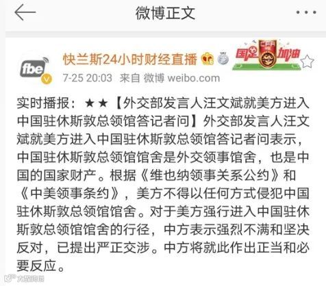 7月21日美国突然要求中国在72小时之内关闭休斯敦领事馆是一件非常严重的外交事件,更是美国一件非常无理而且很过分的行为。