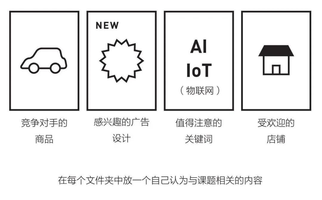 为了提高对信息的敏感度,可以准备几个透明的文件袋或者文件夹,然后将各种各样的图片、从杂志和报纸上剪下来的内容、写在纸上的关键词等放在里面。如果没有透明的文件袋或文件夹,用 A4 纸也可以。