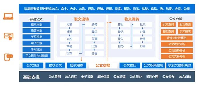 支持《党政机关公文格式》(GB/T 9704-2012)规定的15类公文的起草,涵盖拟稿、核稿、审稿、签发、编号、排版、打印、分发、归档等工作,结合移动审批,规范又便捷。