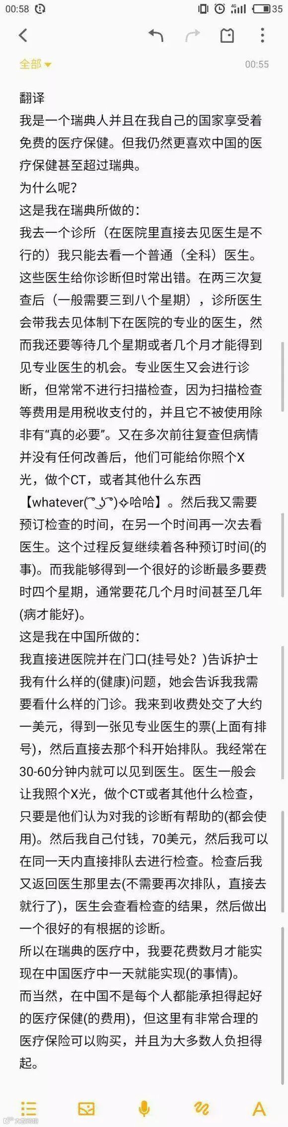 最近一个瑞典人在境外某网站(可能是敏感词)发表了一个推文——居然是推崇中国的医疗体制,并且将之与瑞典的“免费医疗”做对比——这个推文在网站上很短就获得了7.8万个赞。