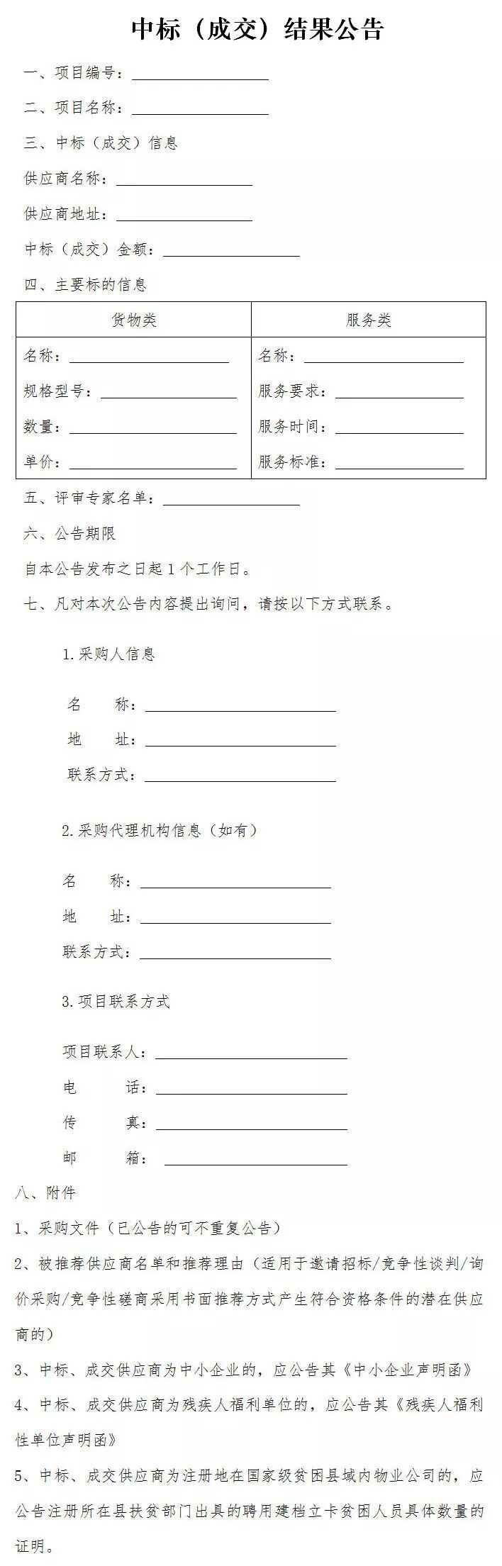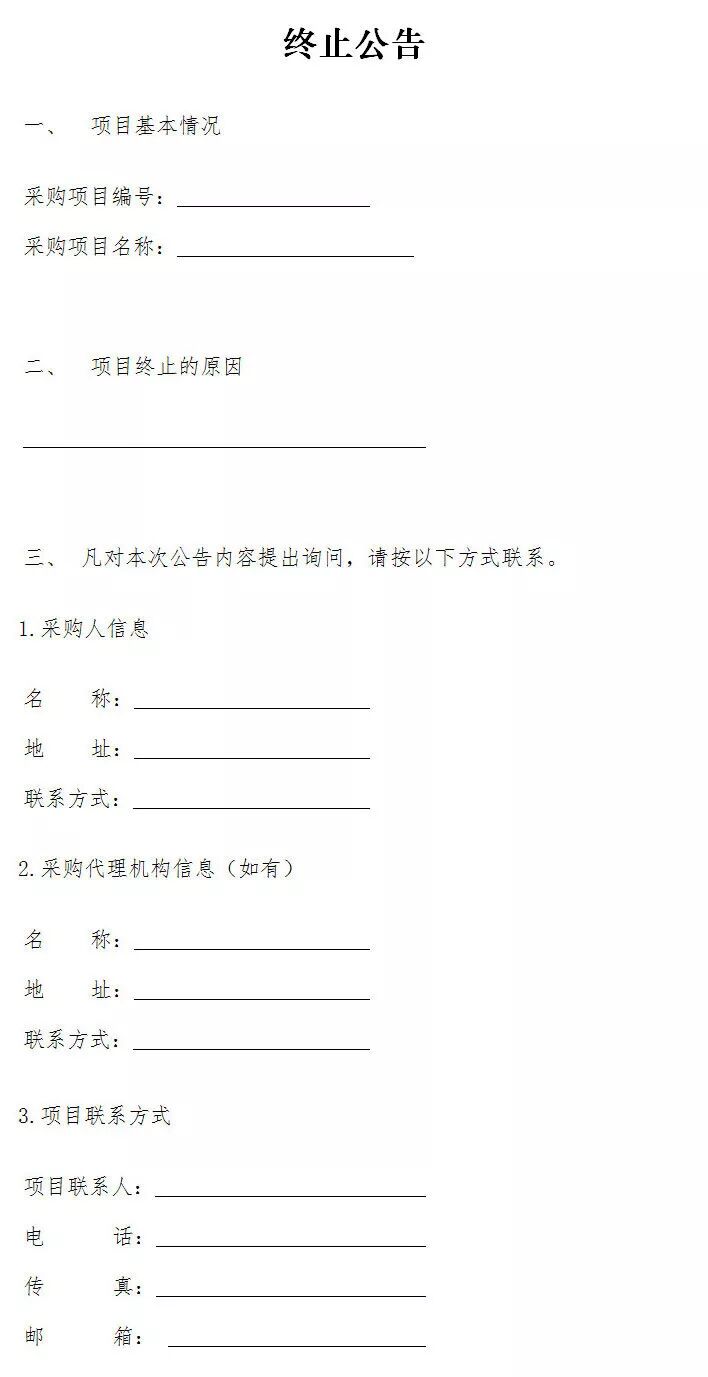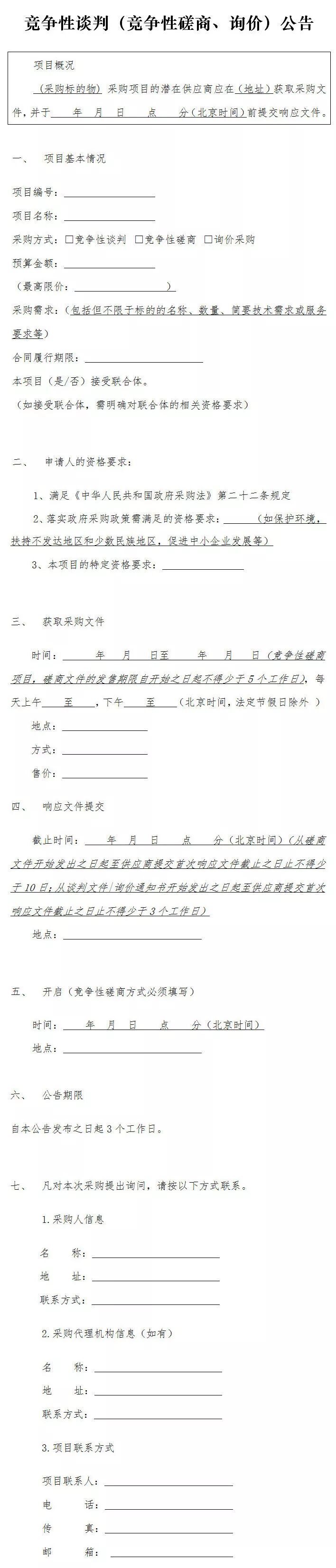 《征求意见稿》共包括了12份政府采购公告和公示格式,分别为:资格预审公告;招标公告;竞争性谈判(竞争性磋商、询价)公告;中标(成交)结果公告;更正公告;终止公告;合同公告;公共服务项目验收结果公告;单一来源采购公示;投诉处理结果公告;监督检查处理结果公告;集中采购机构考核结果公告。