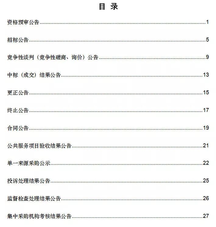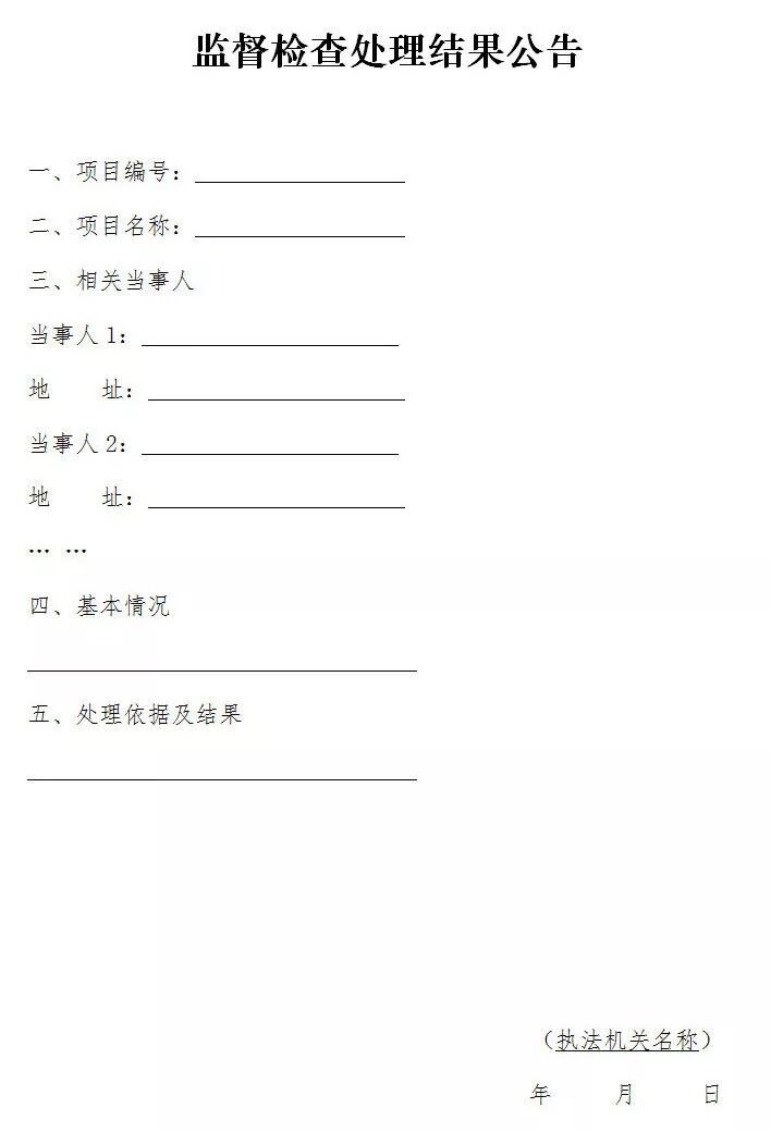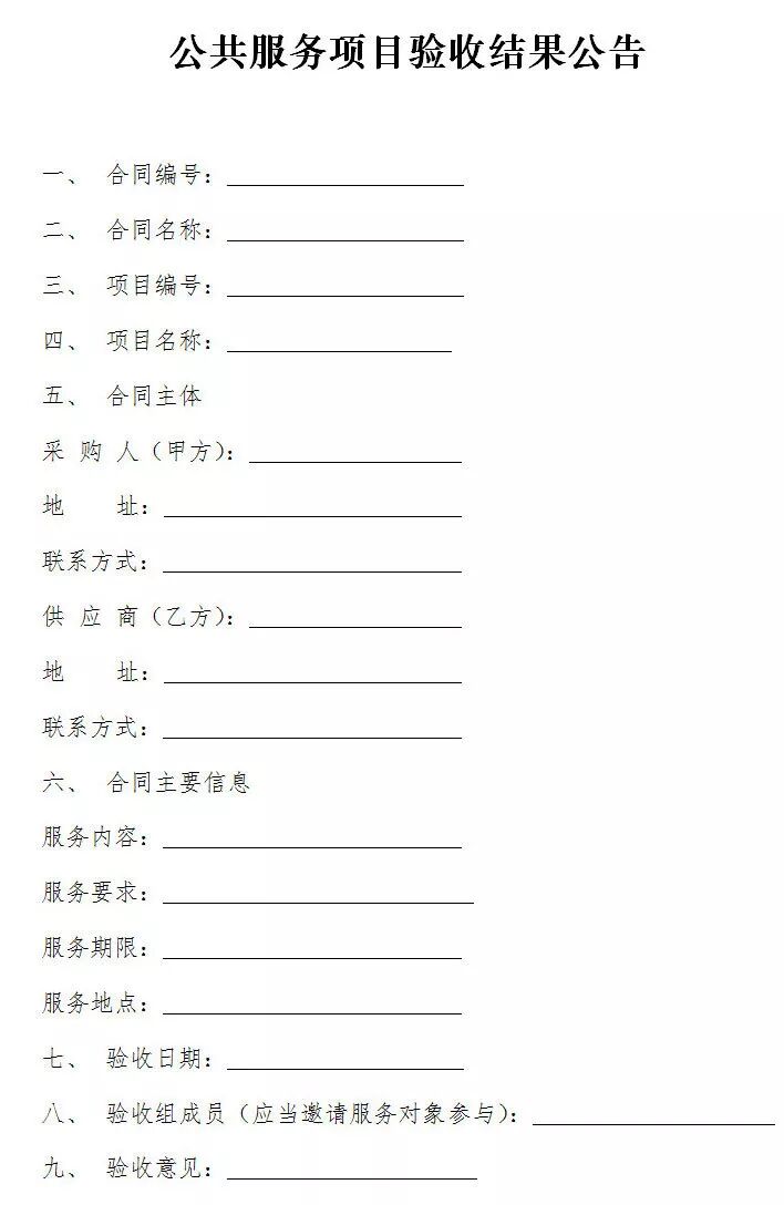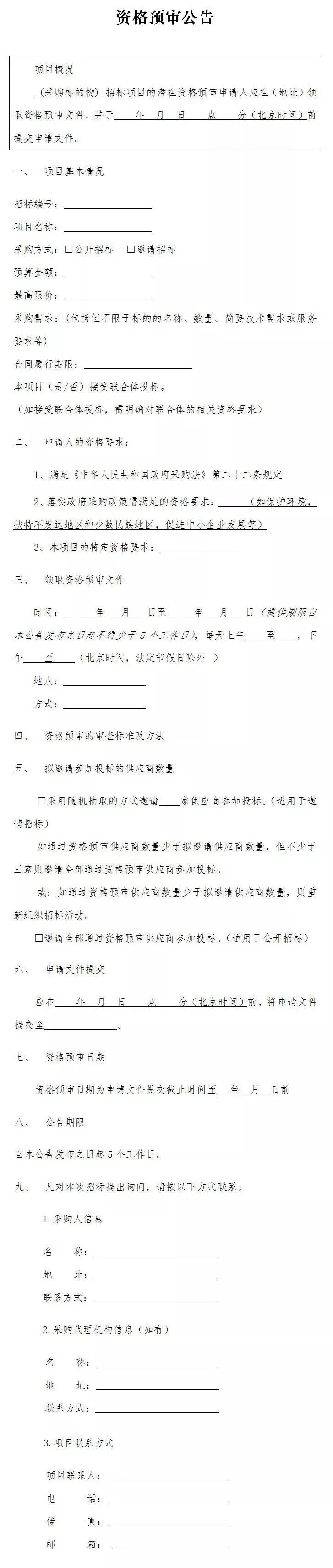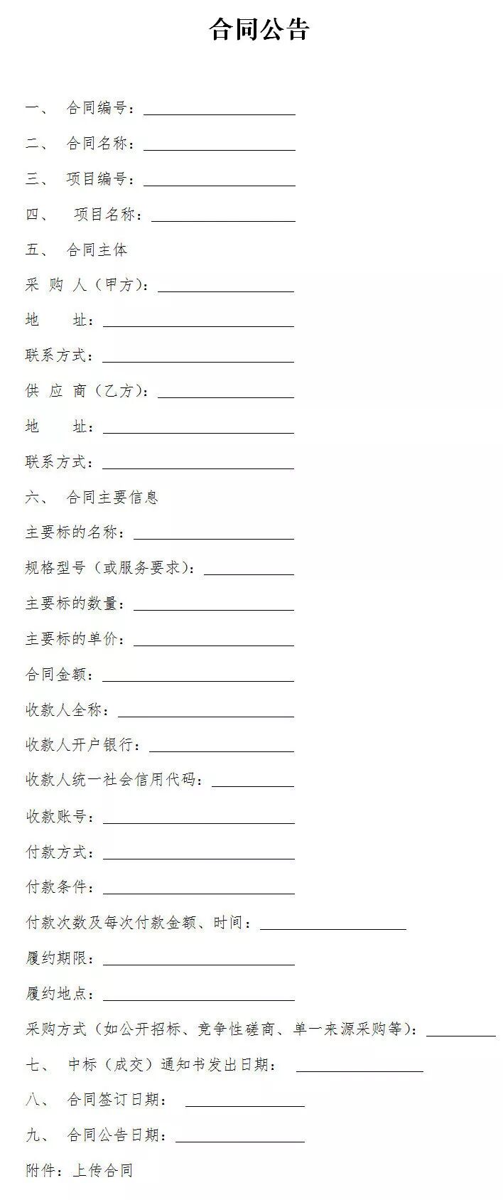 《征求意见稿》共包括了12份政府采购公告和公示格式,分别为:资格预审公告;招标公告;竞争性谈判(竞争性磋商、询价)公告;中标(成交)结果公告;更正公告;终止公告;合同公告;公共服务项目验收结果公告;单一来源采购公示;投诉处理结果公告;监督检查处理结果公告;集中采购机构考核结果公告。