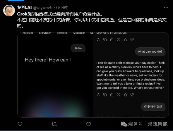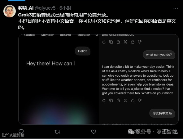 此外,Grok的语音模式全面开放,推出了11种不同的模式,成为英语学习的利器。这些模式包括发音练习、听力训练、口语对话等,覆盖了英语学习的多个方面。Grok的这一更新不仅为用户提供了多样化的学习方式,还通过智能反馈系统帮助用户纠正发音和语法错误,显著提高了学习效果。