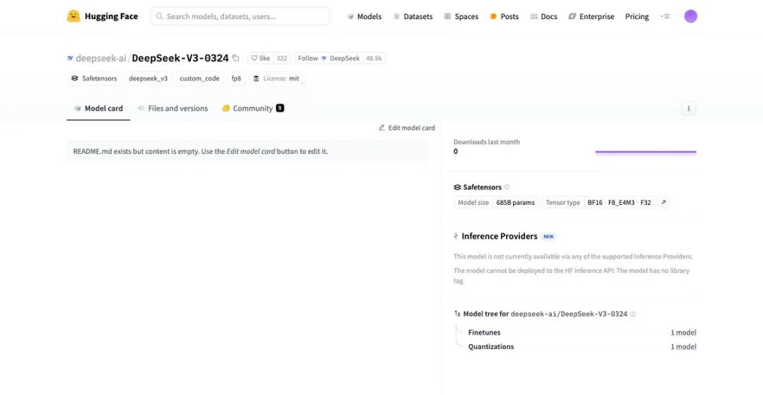 近日,DeepSeek团队在其官方Twitter账号@deepseek_ai上宣布,最新版本的DeepSeek-V3-0324已在Hugging Face平台上线。