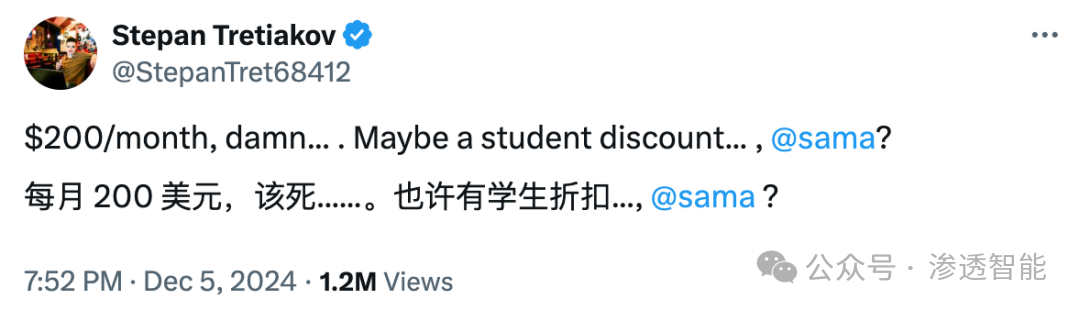 另一位网友直言表达了大多数人的想法:每月200美元实在太贵了,是否考虑提供学生折扣,并且@了Sam Altman。