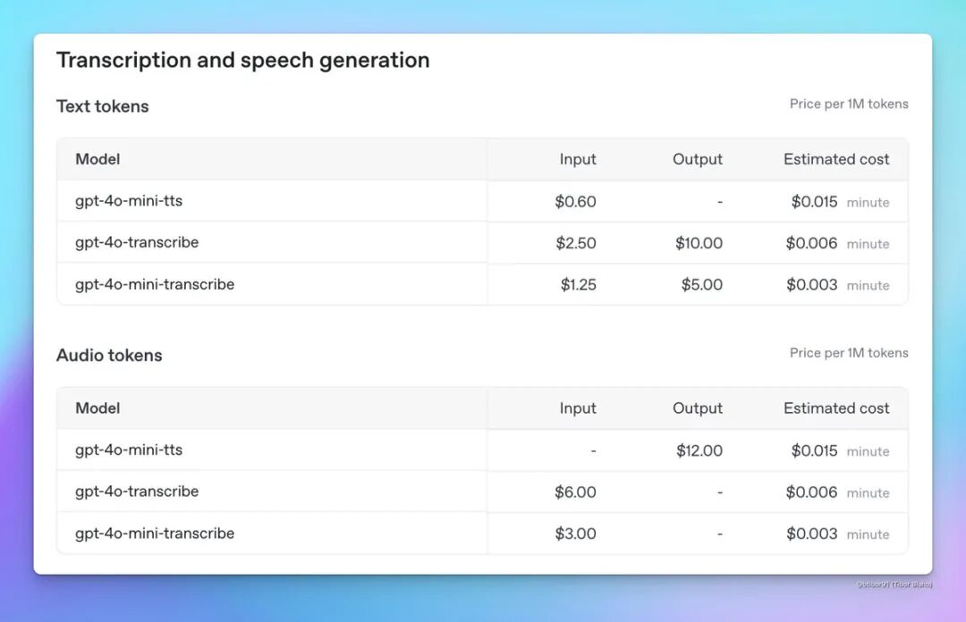 - gpt-4o-mini-transcribe:每百万个token $1.25(文本输入),$5.00(文本输出),$3.00(音频输入)