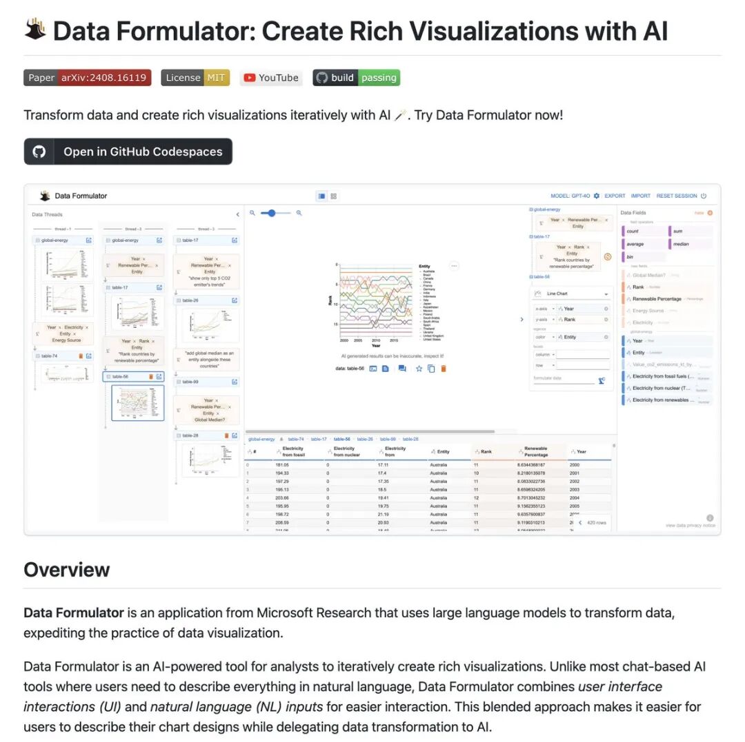 Data Formulator的优势在于其易用性和强大的数据处理能力,即使是不具备编程背景的用户也能够快速上手,实现高效的数据分析和展示。此外,该工具还完全开源,意味着开发者可以自由地查看、修改和贡献代码,从而进一步提升工具的功能和性能。