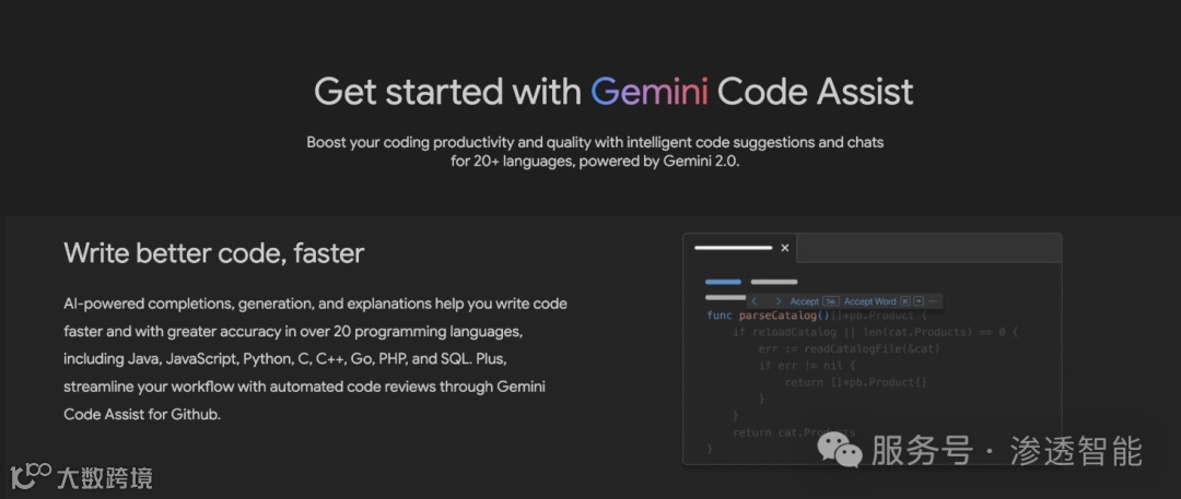 Gemini Code Assist 是一款由 Google 开发的 AI 编程助手,旨在提升开发者效率,简化代码编写流程。它利用先进的机器学习模型,能够理解代码上下文,提供智能代码补全、错误检测和修复建议,甚至可以根据自然语言描述生成代码片段。Gemini Code Assist个人版已在全球范围内推出,由 Gemini 2.0 提供支持。Gemini Code Assist 中 AI 生成的建议的质量比以往任何时候都好,并准备好解决开发人员面临的无数日常挑战,无论他们是业余爱好者还是初创公司开发人员。