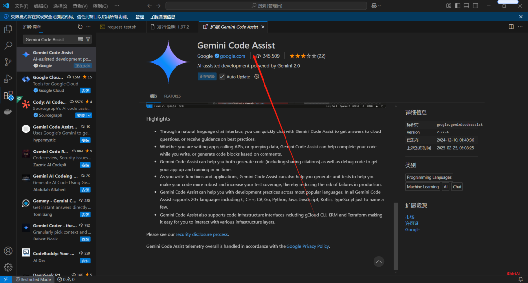 1.介绍一下vs code当时如何使用,首先下载插件,搜索Gemini Code Assist,点击安装