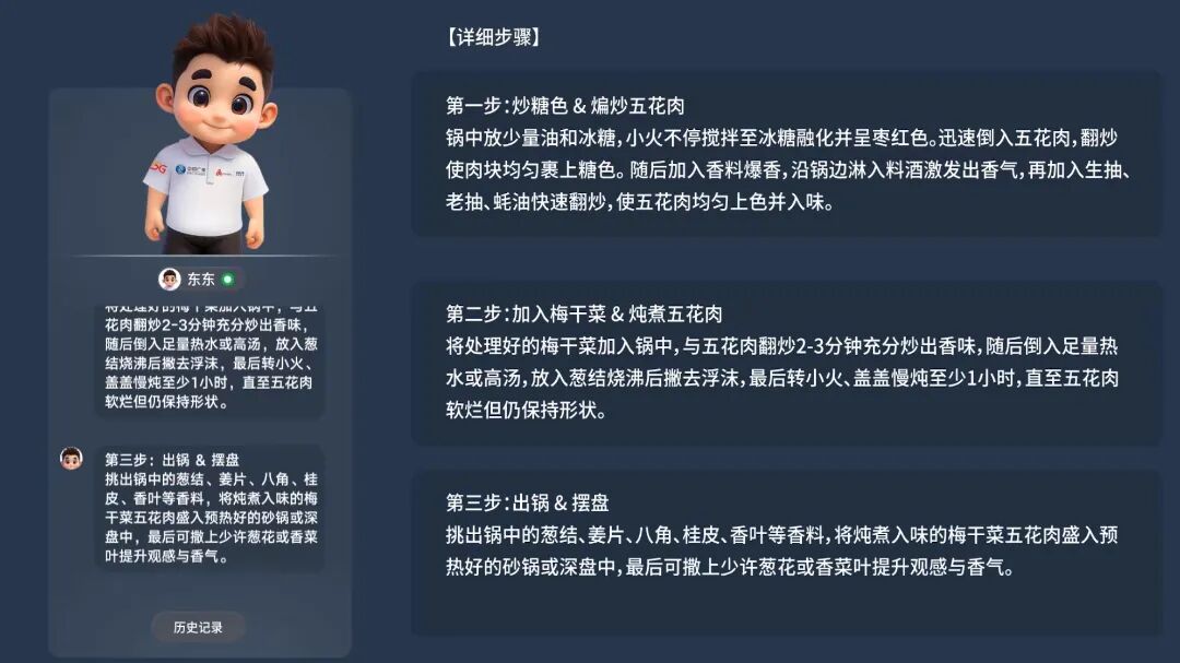 第二轮演示,俞翔用上海话发出“做一道本帮菜——梅干菜红烧肉”的指令,东东即刻弹出菜谱,并配合完成食材下单,全程耗时不到30秒。这项创意功能为用户开启了智慧看电视的新玩法。系统可通过本地边缘推理确定意图,再调用航旅、地图、天气、生活服务等多源 API;在300毫秒量级时延下快速完成用户提出的服务指令。例如,用户提出“规划三天两夜亲子游”,“东东”就会综合机票、酒店、天气与景区数据生成行程沙盘并同步到手机。语音交互、大字界面和三键确认降低了高龄用户的操作门槛,使电视首次承担起“客厅服务中枢”的角色,帮助银发长辈跨越数字鸿沟。
