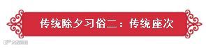 按照老礼,除夕夜传统的座次是“尚左尊东”、“面朝大门为尊”。年宴的首席为辈分最高的长者,末席为最低者。如果是请客,首席为地位最尊的客人,主人则居末席。首席未落座,其余都不能落座,首席未动手,大家都不能动手。