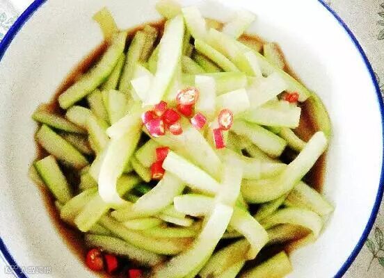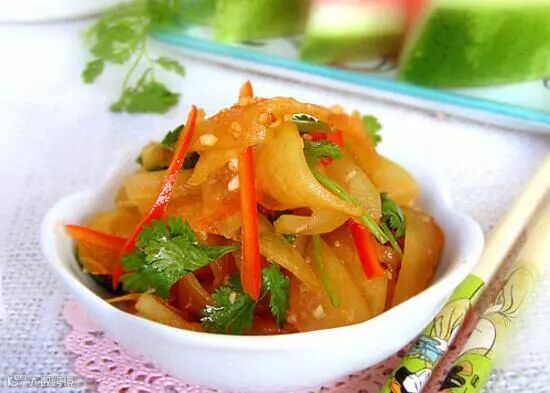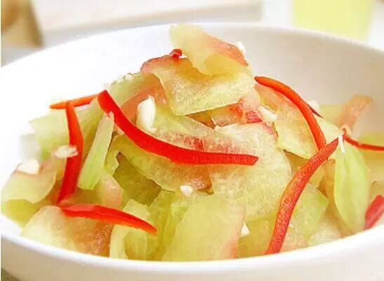 功效:这道冰冰爽爽的凉拌西瓜皮真的是既简单有爽口,还有着很高的营养价值。西瓜皮里面的含糖量很少,既可以清热去火,又可以美白美容,加上腌过之后脆爽的口感,简直是夏日解暑小菜的首选之一!
