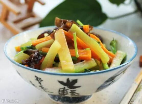 功效:西瓜皮本身就有着利尿消肿,清热解毒的功效,加上可以明目的胡萝卜和黑木耳滋补润燥的作用,这道清炒西瓜皮已经具有了降血压血脂和养心防止中风的神奇功效,另外这道菜做法简单,含糖量低,是糖尿病人的首选小菜之一。