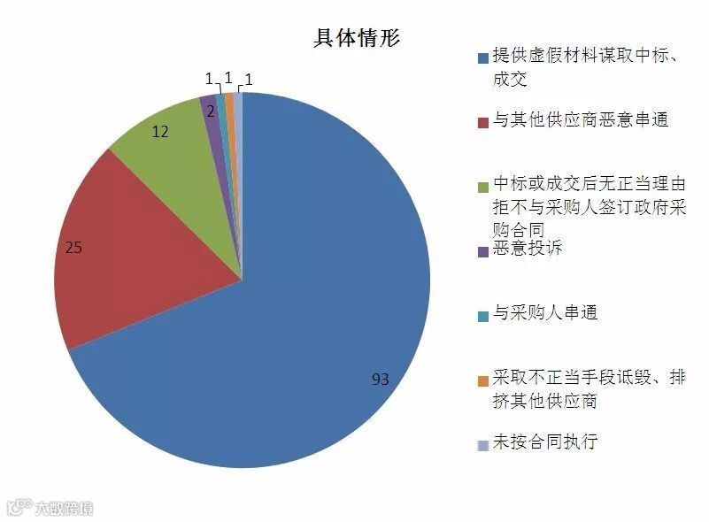 从上图可以看出,供应商提供虚假材料谋取中标、成交的情形占到了68.8%,是政府采购严重违法失信行为最主要的表现形式。有93家供应商存在此类问题,提供虚假材料的具体行为主要包括:提供虚假业绩,伪造经营许可证范围;提供虚假的认证材料、检测报告;伪造完税票据和社保缴费票据等。