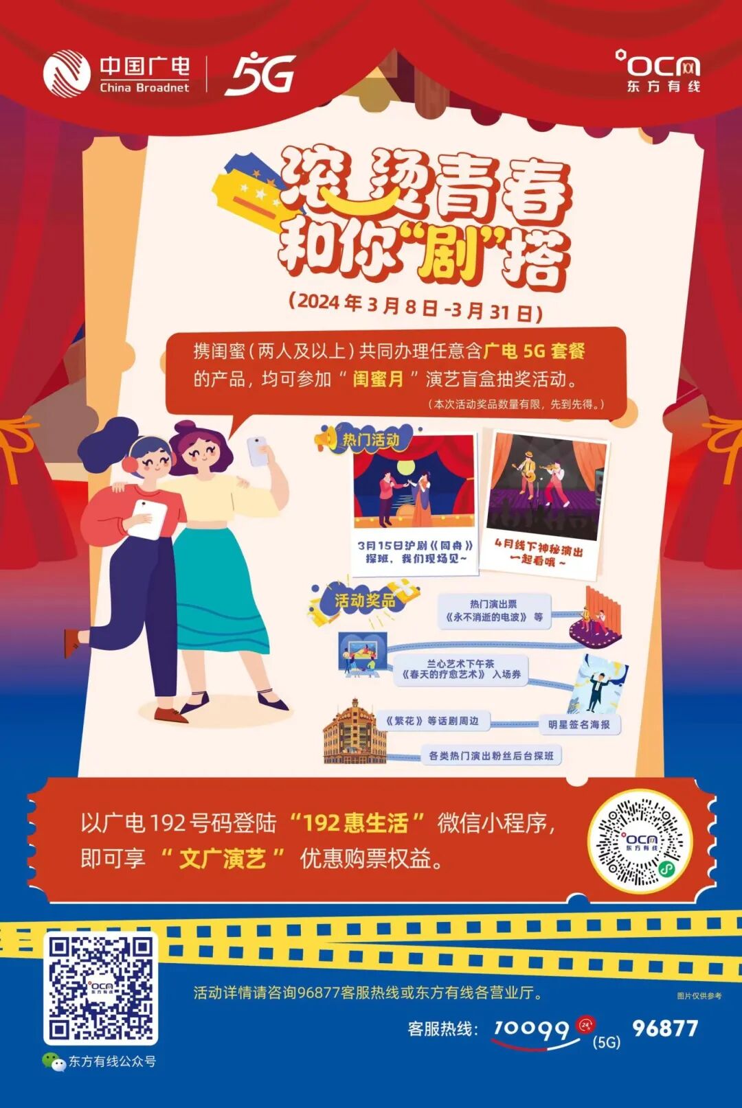 携闺蜜(两人及以上)前往指定营业厅共同办理任意含广电5G套餐的产品,均可参加“闺蜜月”演艺盲盒抽奖活动。