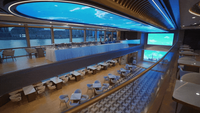 舷侧采用两层贯通超大面积玻璃幕墙结构,二层甲板采用大面积镂空结构设计,突破传统规范设计的限制,实现了客舱区的极致通透性,为市民游客提供沉浸式融合氛围体验。该游船现已全面覆盖中国广电5G网络信号及无线WiFi,将网络传输通道与岸边基站作无线耦合、实现信号回传,为后续打造江上沉浸式互动演艺、数字多媒体空间、新闻发布直播、AR灯光秀等新体验、新场景打下坚实的网络基础。