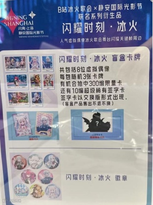 精选人气虚拟偶像冰火歌会舞台闪耀关键帧,制作系列衍生品。其中包括盲盒卡牌,有机会抽到300编限量卡和10编签名卡。闪耀时刻·冰火礼包,限量发售500份,其中包括3个系列徽章+3包盲盒卡牌。礼包卡牌必出限量卡。