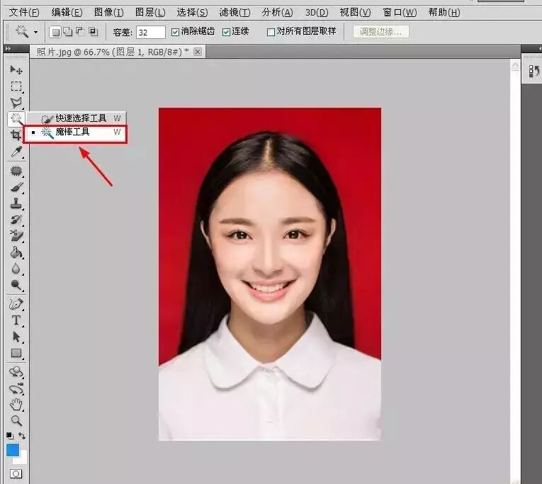 1 点击左栏「魔棒工具」,在照片的红色底色那里点击一下,会出现“虚线选区”。