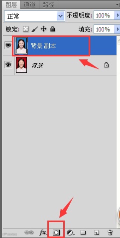 3 现在要将人物的脸色还原。选中背景图层副本,点下面的蒙版工具添加一个蒙版。