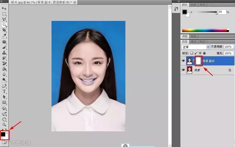4 添加完以后,背景图层副本旁边会出现一个蒙版。选中这个蒙版,并且确保前景色是黑色。